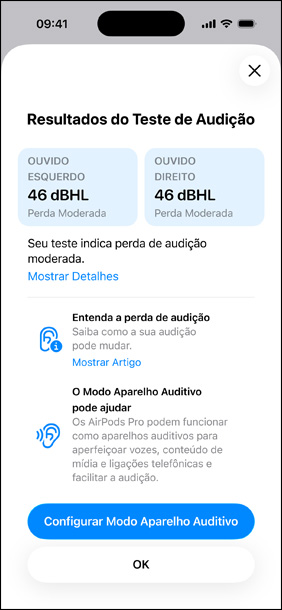 Resultados imediatos. Auxílio imediato. Ao concluir o teste, você obtém um perfil personalizado com resultados fáceis de entender e informações sobre sua audição. Se você tiver pouca ou nenhuma perda auditiva, mas ainda assim se beneficiaria de ouvir algumas frequências com mais clareza, pode configurar o Assistente de Mídia e ajustar o áudio em conteúdos e chamadas. E, se você percebeu perda auditiva leve a moderada, poderá configurar o recurso de Aparelho Auditivo.