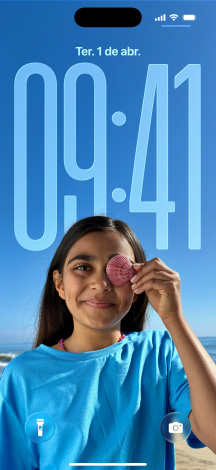 As horas se adaptam dinamicamente à foto de fundo e às notificações, mantendo a pessoa ou objeto em destaque. Quando você move o iPhone, o novo efeito 3D muda a perspectiva da imagem6.