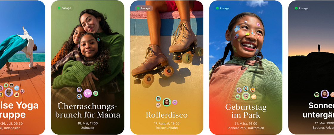 Apple Einladungen ist eine neue Möglichkeit, einzigartige Einladungen für deine wichtigsten Momente zu erstellen. Wähle für deine Einladung einen passenden Hintergrund aus oder verwende KI, um ein völlig neues Bild zu generieren. Und mit Apple Music, Fotos, Karten und mehr kannst du dein Event zum Leben erwecken. Versende die Einladung dann an alle deine Gäste und verfolge ihre Rückmeldungen. Du hast also alles, was du für eine erfolgreiche Party brauchst, direkt in deinem iCloud+ Abonnement.