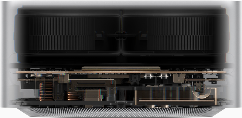 19,7-ruutsentimeetrise Mac Studio korpuses on jahutussüsteem, mis on disainitud nii, et M4 Max või M3 Ultra saaksid sooritada intensiivseid ülesandeid välkkiirelt. Ja Mac Studio jääb isegi sellise uskumatu võimsuse juures vaikseks, nii ei sega see kunagi su tööhoogu.