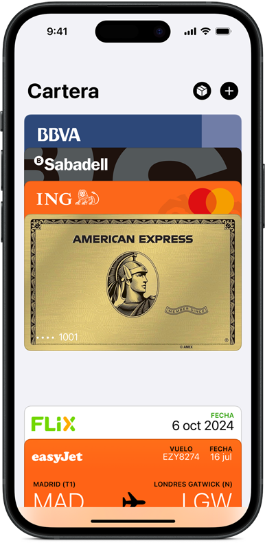 Es facilísimo. Añade una tarjeta de crédito, débito o prepago a la app Cartera del iPhone. No te olvides de hacerlo en todos los dispositivos Apple con los que quieras usar Apple Pay: funciona en el iPhone, Apple Watch, Mac y iPad. Y si te cambias de iPhone, puedes pasar tus tarjetas automáticamente al nuevo dispositivo con un sencillo paso.