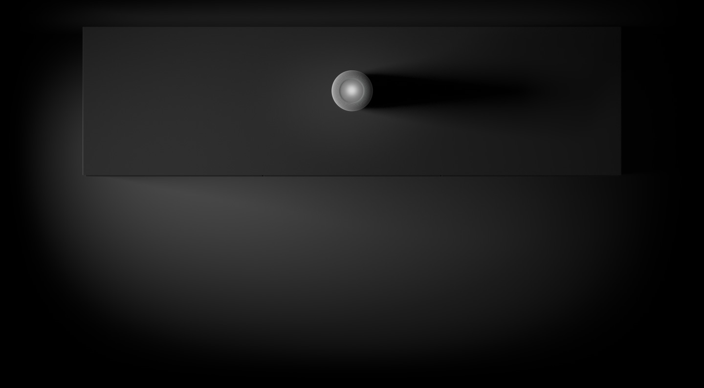 A visualization of Spatial Audio, a bird's eye view of HomePod with rippling rings of sound particles emanating from it, animation