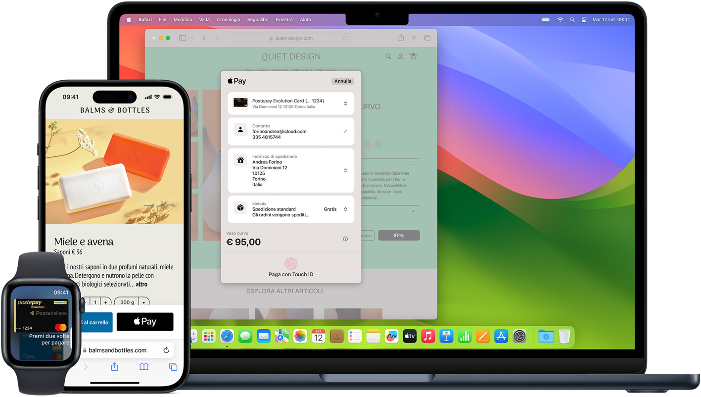 Apple Pay è più sicuro di una vera e propria carta di credito, di debito o prepagata. Gli acquisti su iPhone, Apple Watch, Mac o iPad si possono fare solo usando Face ID, Touch ID o il tuo codice di accesso. La tua identità e il numero della tua carta non vengono condivisi con l’esercente. E i dati della tua carta non vengono mai memorizzati sui server Apple.