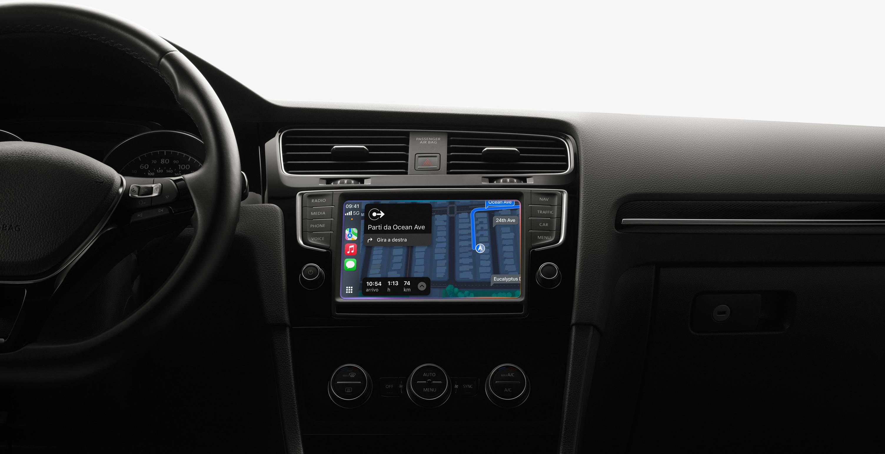 Guida in modo più sicuro, con Siri. Premi il tasto sul volante (se hai CarPlay)1 oppure usa la voce per chiedere indicazioni stradali, far partire una chiamata o far sapere a chi ti aspetta quando arriverai. Senza mai togliere lo sguardo dalla strada.