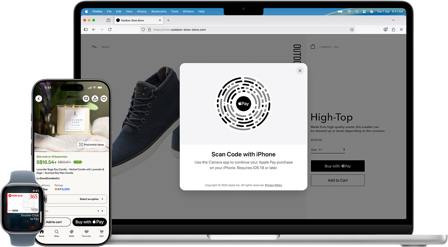 In apps and online. Use Apple Pay to seamlessly make purchases in Safari and other browsers — on iPhone, iPad, Mac and other computers — without the lengthy checkout forms. On an Apple device, click or tap the Apple Pay button and pay with a touch or glance. On a non-Safari browser, scan the Apple Pay code with your iPhone camera and use your iPhone to complete your purchase.2 You can even use Apple Pay to subscribe to services like Apple Music and Apple TV, buy apps and games on the App Store and upgrade your iCloud storage.
