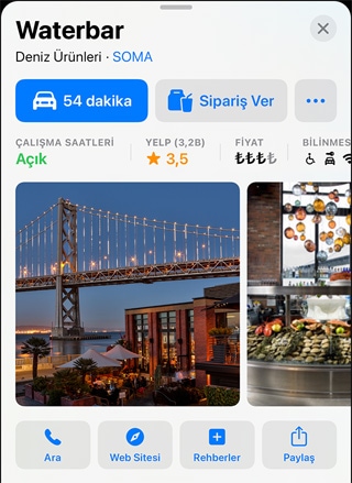 Gideceğiniz yeri seçin, interaktif yer kartında ihtiyaç duyduğunuz her şeyi bir bakışta görün. Adres, çalışma saatleri, web sitesi, telefon numarası gibi bilgilerin yanı sıra fiyat aralığı, fotoğraf galerileri, ilgili Rehberler, kabul edilen ödeme türleri, hatta köpeğinizle gidip gidemeyeceğiniz gibi birçok ayrıntıyı da görüntüleyin. Flyover veya Etrafa Bak’ı açarak konum ve çevresindekiler hakkında fikir edinin.