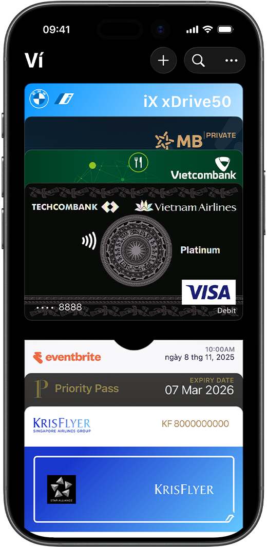 Ứng dụng Ví hoạt động ngay trên iPhone của bạn. Đây là nơi lưu trữ an toàn cho thẻ tín dụng, thẻ ghi nợ hoặc thẻ nội địa, thẻ giao thông công cộng, vé máy bay, vé sự kiện, chìa khóa xe hơi và hơn thế nữa, tất cả ở cùng một nơi. Và tất cả đều tương thích với iPhone hoặc Apple Watch, nhờ vậy mà bạn có thể mang ít đồ hơn nhưng lại làm được nhiều việc hơn.